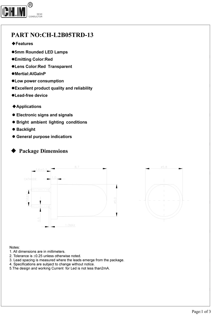 Description:5mm Rounded LED Lamps,Lens Color:Red Transparent,eLow power consumption.Excellent product quality and reliability.