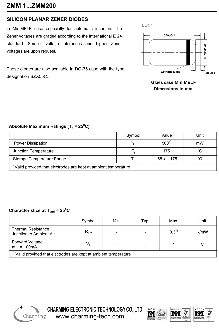 Description:SILICON PLANAR ZENER DIODES in MiniMELF case especially for automatic insertion. TheZener voltages are graded according to the international E 24standard.Smaller voltage tolerances and higher Zenervoltages are upon request.