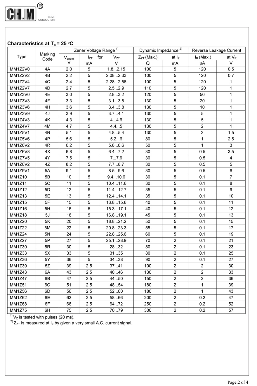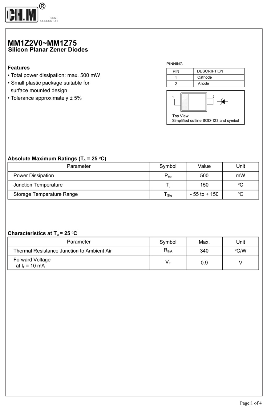 Description:MM1Z2V0~MM1Z75 Silicon Planar Zener Diodes,Total power dissipation: max.500 mW, Small plastic package suitable for surface mounted design,Tolerance approximately ± 5%