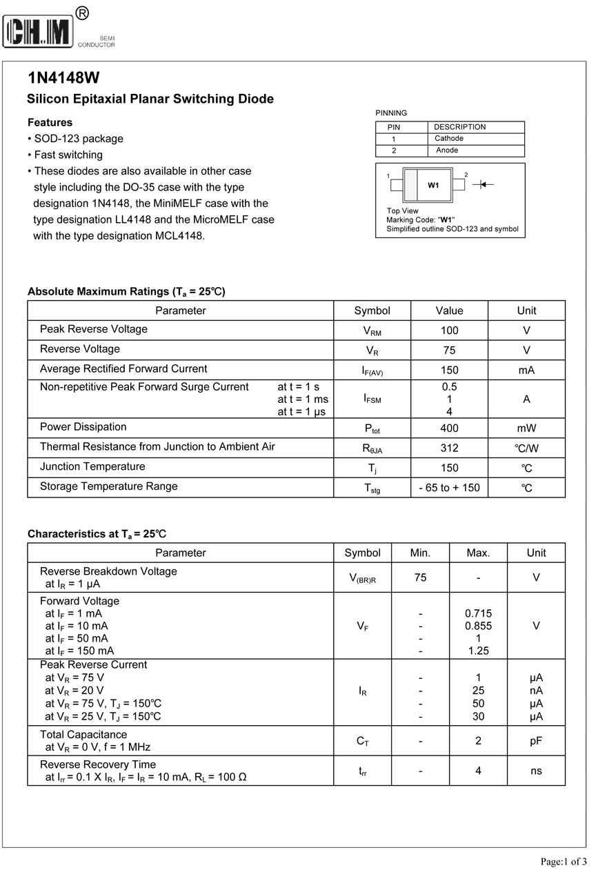 designation 1N4148, the MiniMELF case with thetype designation LL4148 and the MicroMELF casewith the type designation MCL4148.